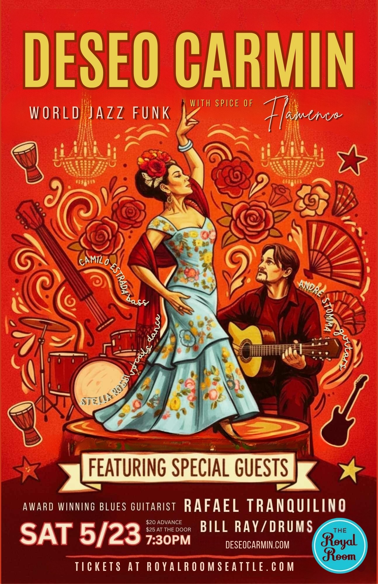 Prepare for an electrifying evening of rhythm, passion, and global sound as DESEO CARMIN, Seattle‑based award‑winning Latin Jazz–Funk–Flamenco fusion band, brings its high‑octane performance to the stage. Known for their fiery musicianship, theatrical flair, and genre‑bending sound—often described as “Spanish music with an edge”—the band promises an unforgettable night of music and dance.