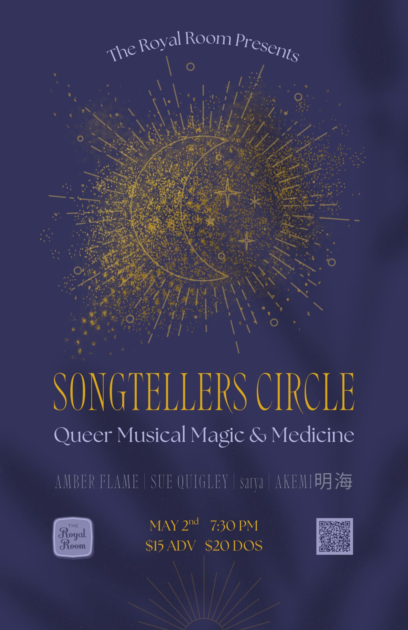 Join Amber Flame, Sue Quigley, sarya, Akemi 明海 (and maybe more) for a musical night of queer stories and healing.