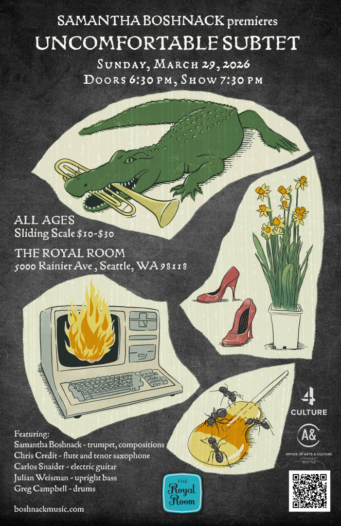In 2020, Boshnack invited artist and activist Natasha Marin and Pushcart-winning poet Jane Wong to join her in a series of correspondences about “uncomfortable subjects.” Over the ensuing pandemic years the three women discussed racism, climate crisis, mental health, fascism, and the tensions of making art, finding hope, and staying connected amid social upheaval. Boshnack wove words and themes from these conversations and struggles into a suite of seven compositions, debuting them with a thirteen-piece alt-chamber orchestra at the 2024 Earshot Jazz Festival.
